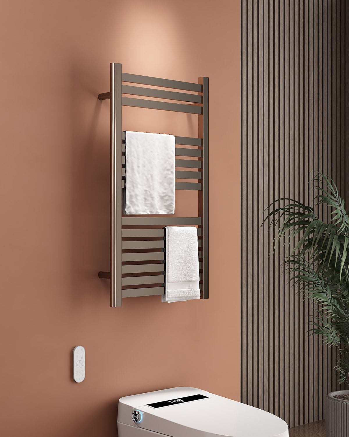 15桿電熱毛巾架 15 bar heated towel rail 材質Material:SS201/SS304 功率Power:220V/175W 表面Surface:PVD Gun Black PVD槍黑 尺寸Size:500*110*900mm 包裝Ctn size:520*60*930mm