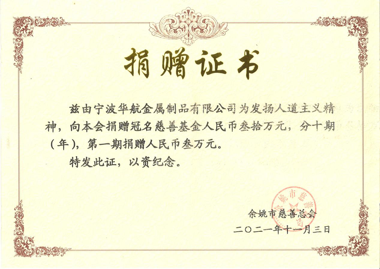 2021年11月3日,寧波華航金屬制品有限公司為了幫助扶貧濟(jì)困支持慈善事業(yè),華航公司向余姚市市慈善總會(huì)捐贈(zèng)30萬(wàn)元,并在余姚市慈善總會(huì)設(shè)立華航慈善基金,為建設(shè)和諧社會(huì)盡一份心力。